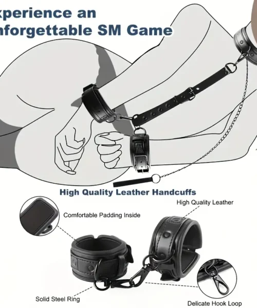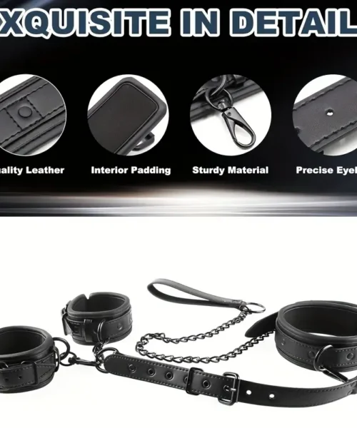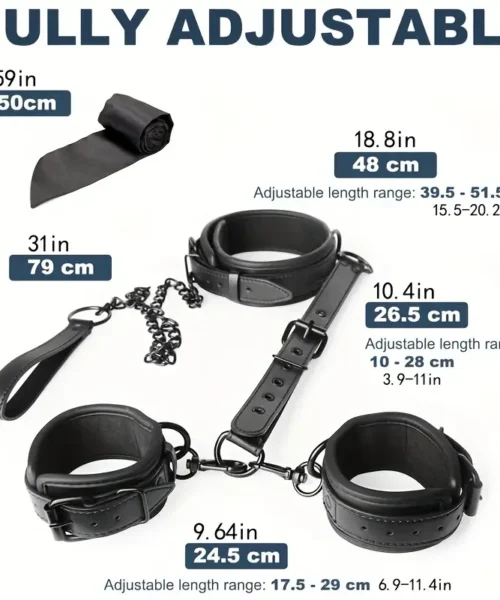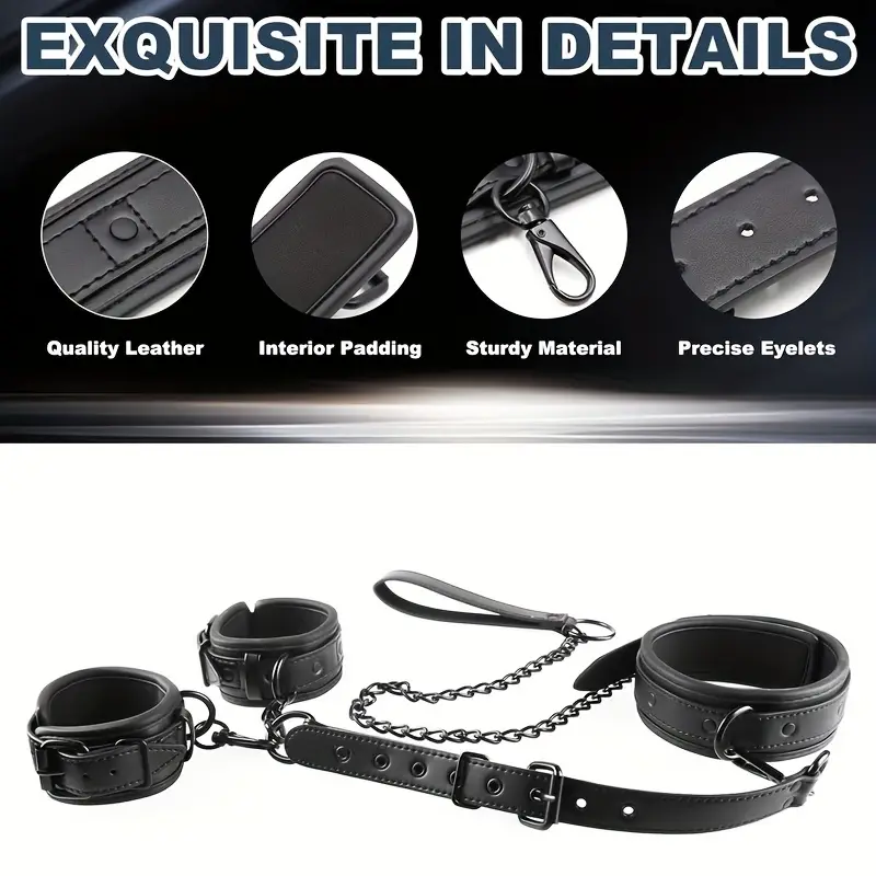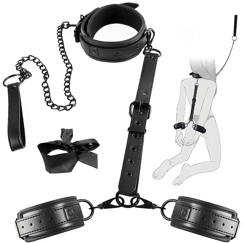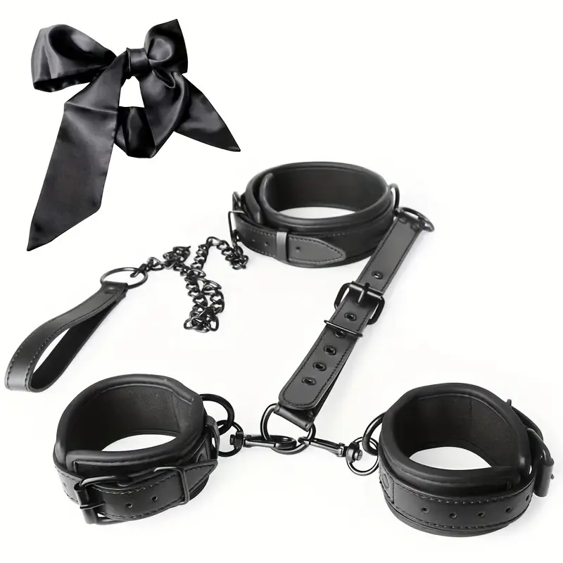 Explore the ultimate in sensual experiences and unleash your inner desire and control! This 2-piece erotic bondage set Contains soft leather and neoprene reverse cuffs with a luxurious silk blindfold for a new intimate experience with your partner.
