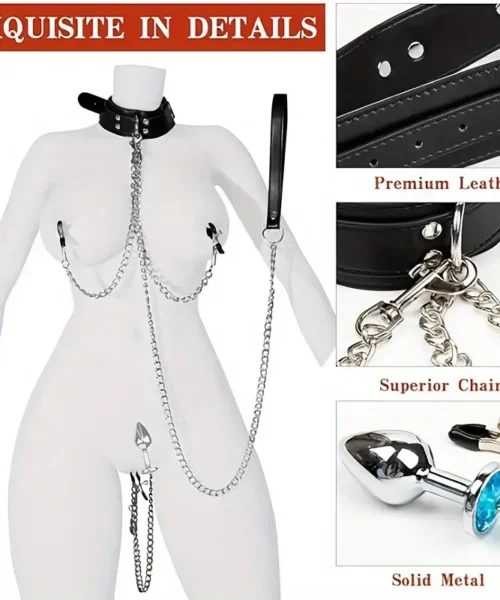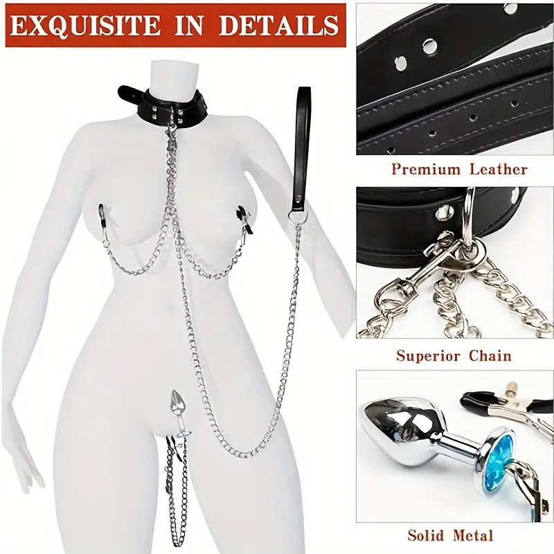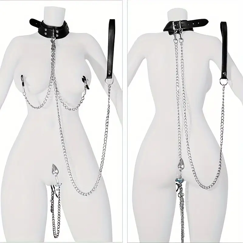 Black Leather BDSM Harness with Metal Chains, Nipple Clamps, and Anal Plug – SM Accessory Kit for Women